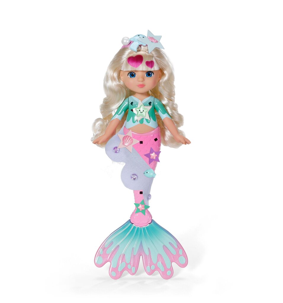 Sirena Sparkle adoră să schimbe și să se joace cu culorile. De la cap până la aripioară, poate fi pieptănată, decorată și decorată după propriul stil. Cu accesoriile textile incluse, decorațiunile colorate cu prindere rapidă și un animal drăguț cu aripioară detașabilă, se creează de fiecare dată look-uri noi.